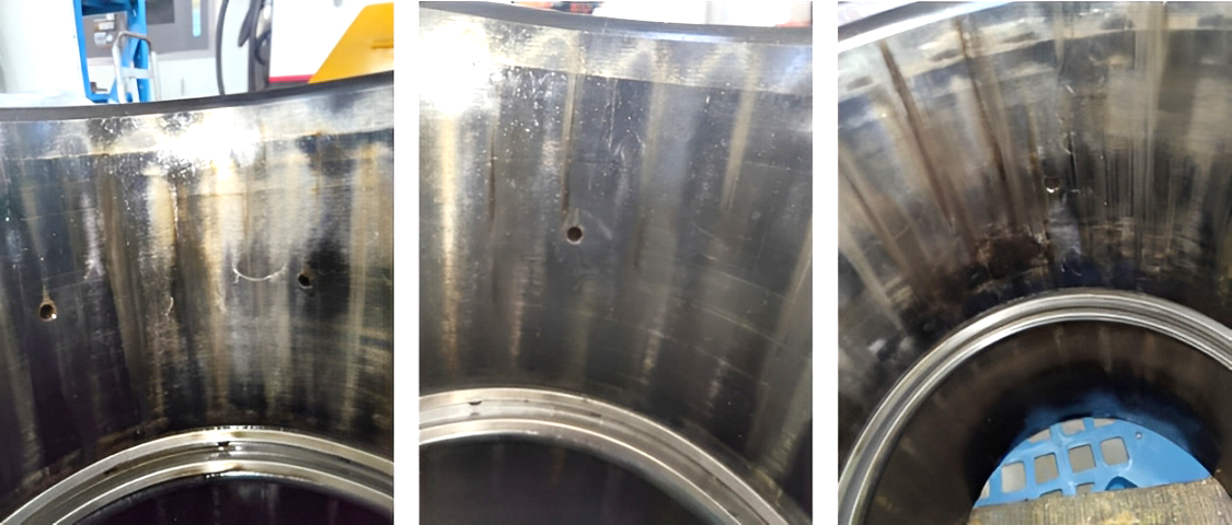 中科煜宸優(yōu)選滿足工藝要求的合金粉末用于行星架軸徑工作面激光熔覆。對于尺寸缺失較多的行星架,采取層間冷卻多次熔覆方式嚴格控制質(zhì)量缺陷以滿足熔覆層尺寸要求,外觀及探傷檢測無裂紋、夾雜、氣孔、未熔合等缺陷。