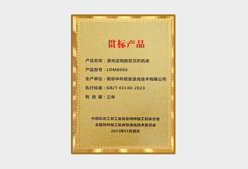 11月16日,中國機床工具工業(yè)協(xié)會特種加工機床分會2023年會員大會在成都成功舉辦。會議頒布了2023年度“貫標產(chǎn)品”名錄。南京中科煜宸激光技術(shù)有限公司的激光定向能量沉積機床-LDM8060憑借所有檢測指標均滿足國標《GB/T4310-2023激光定向能量沉積機床通用技術(shù)規(guī)范》的要求,榮獲了“貫標產(chǎn)品”的榮譽。